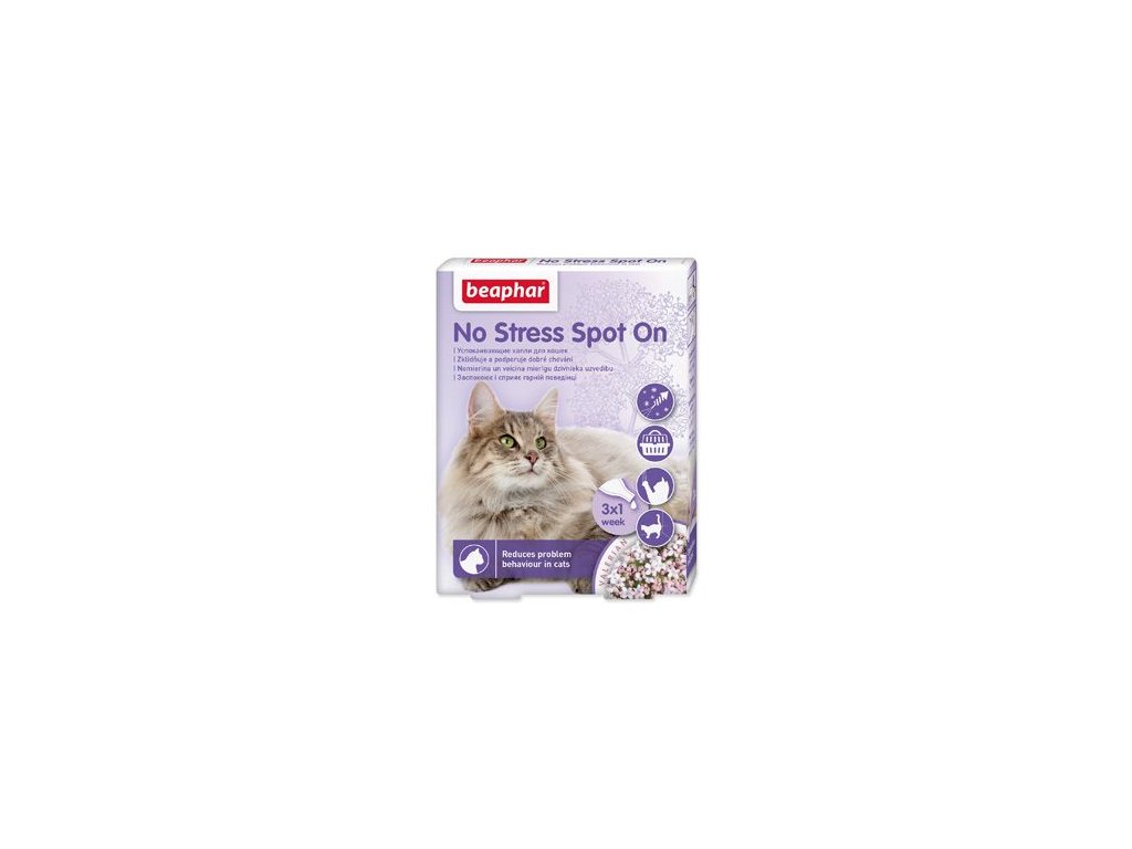 Přípravek ke snížení stresu a zklidnění koček.Beaphar No Stress Spot On je vhodný pro všechna plemena a věkové kategorie koček. Snižuje stres u koček a udržuje je v klidu díky zklidňujícímu účinku extraktu kozlíku lékařského, který je obsažen v mikrokapslích. Ty fungují na principu pomalého uvollňování a dlouhodobého účinku. Používá se v případě nadměrného mňoukání nebo prskání v důsledku odloučení, návštěvy veterináře, při cestování, bouřce či v případě destruktivního nebo nežádoucího územního chování.