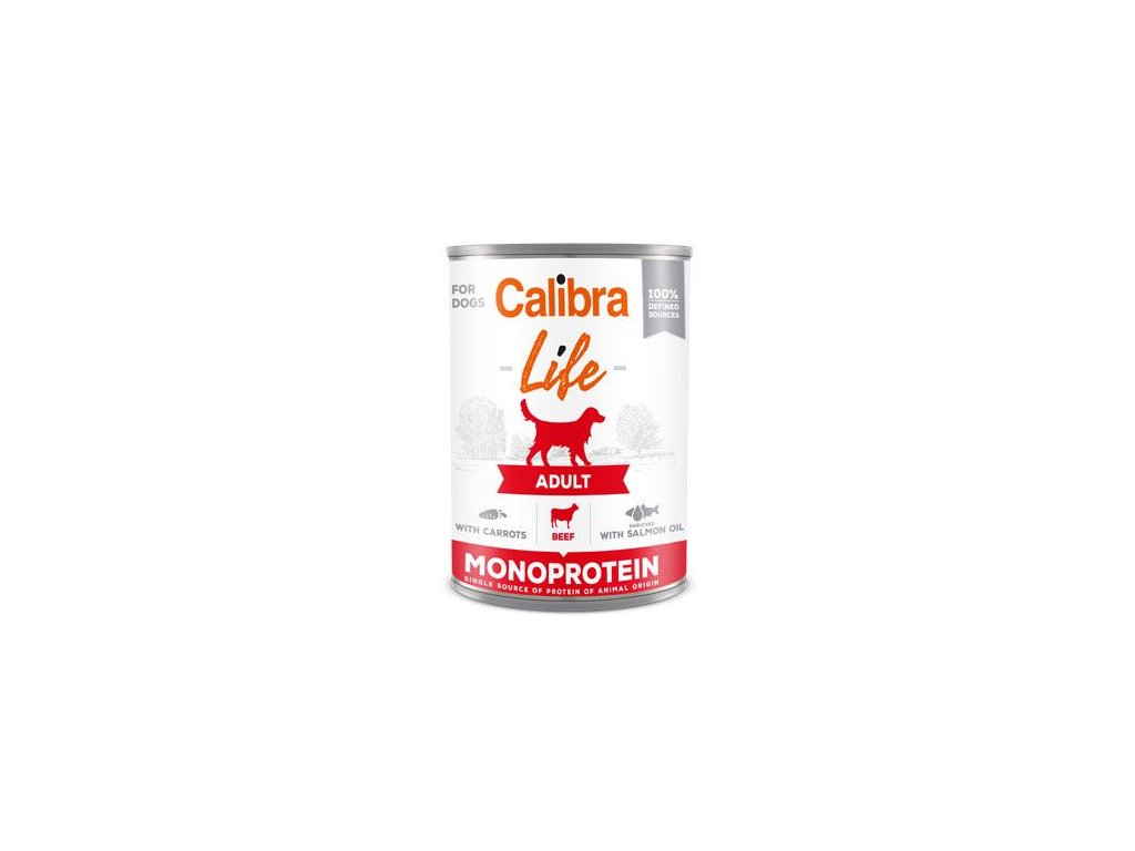 Calibra Dog Life Adult Beef with Carrots – receptura konzervy s hovězím a mrkví je kompletním krmivem, které je určené dospělým psům.Receptura je založena na jediném druhu proteinu, je sestavena z omezeného počtu ingrediencí. Složení konzervy je bez obilovin, bez lepku, obsahuje jen suroviny té nejvyšší kvality, které jsou ze 100% definovaných zdrojů, což má vliv na lehkou stravitelnost krmiva.