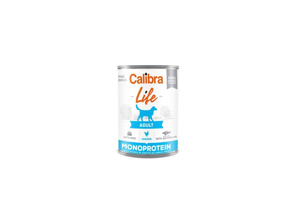 Calibra Dog Life Adult Chicken with Rice – receptura konzervy s kuřetem, kuřecími srdíčky a rýží je kompletním krmivem, která je určená pro dospělé psy.Receptura je založena na jediném druhu proteinu, je sestavena z omezeného počtu ingrediencí. Složení konzervy je bezlepkové, obsahuje jen suroviny té nejvyšší kvality, které jsou ze 100% definovaných zdrojů, což spolu s nízkým obsahem rýže má vliv na lehkou stravitelnost.