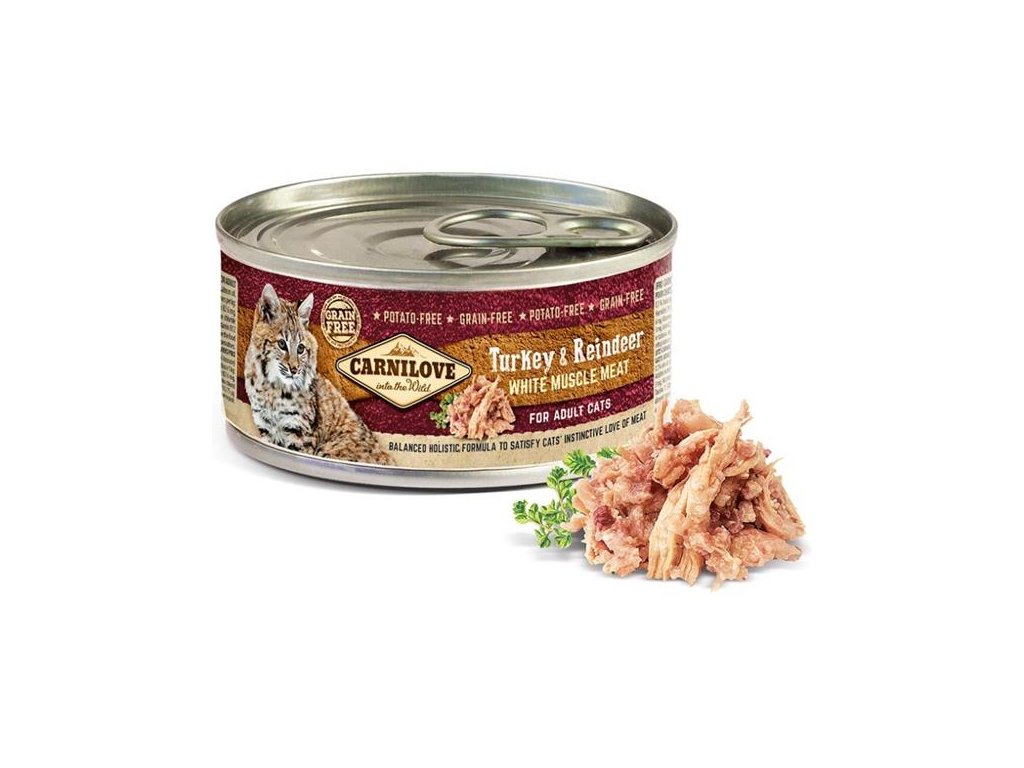 Konzerva pro kočky s bílým krocaním masem ze svaloviny a chutným sobím masem.
