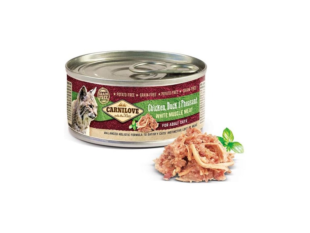 Konzerva pro kočky s bílým kuřecím masem ze svaloviny a chutným kachním a bažantím masem.