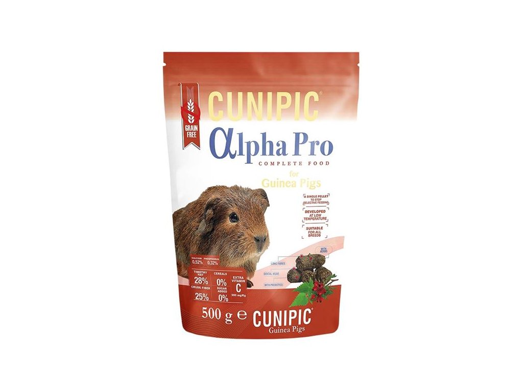 Cunipic Alpha Pro Guinea Pig – morče. Kompletní krmivo bez obsahu obilovin. Zdravá, velice chutná a vyvážená receptura pro morčata. Každá granule obsahuje všechny nezbytné suroviny a vitamíny pro zdraví morčete bez výkyvů v příjmu živin. Krmivo s vysokým obsahem vlákniny (25 %), bez přidaných barviv a cukrů vhodné pro všechna plemena.