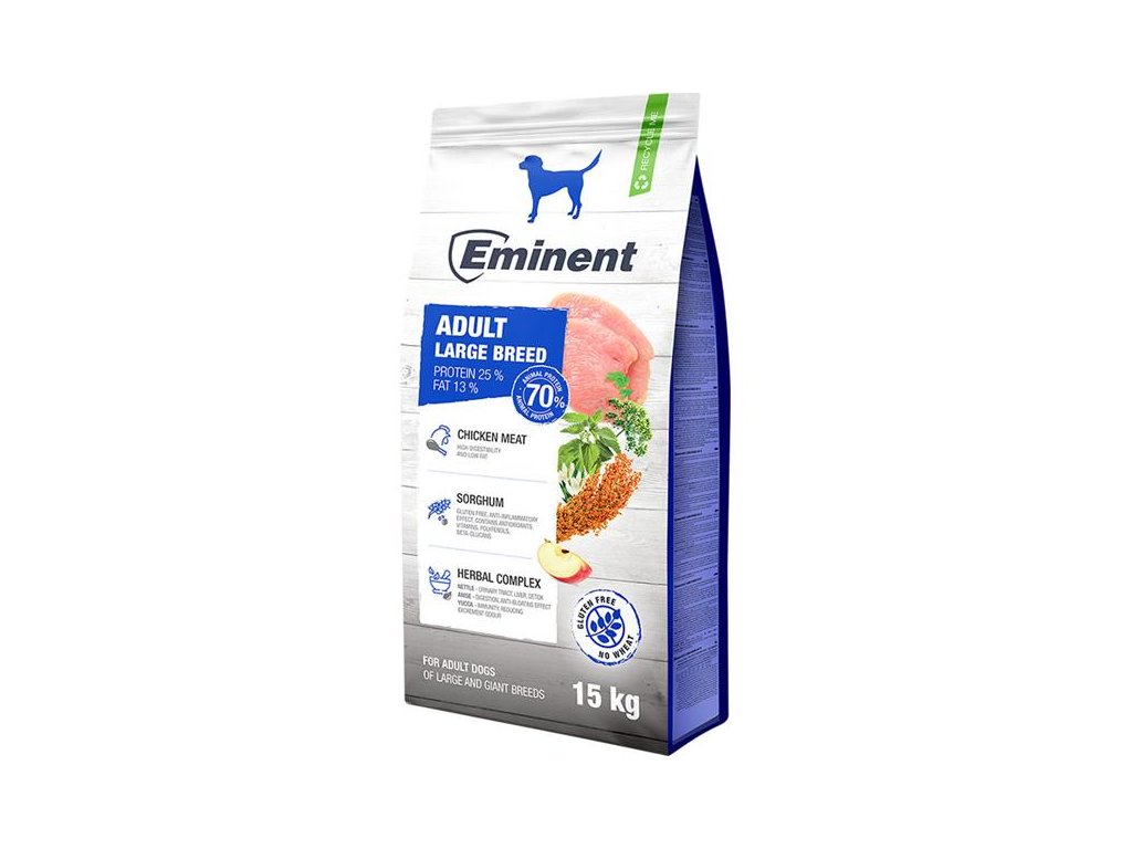 Kompletní krmivo Eminent Adult Large Breed je určené pro dospělé psy velkých a obřích plemen. Speciálně upravená velikost a tvar granulí zabraňují hltání a pomáhají předcházet trávicím problémům. Chondroitin, glukosamin a mangan v krmivu pomáhají udržovat klouby psa pružné a zdravé a minimalizují riziko vzniku degenerativních změn. Ideální poměr bílkovin a tuků poskytuje dostatek energie a podporuje udržení optimální hmotnosti.
