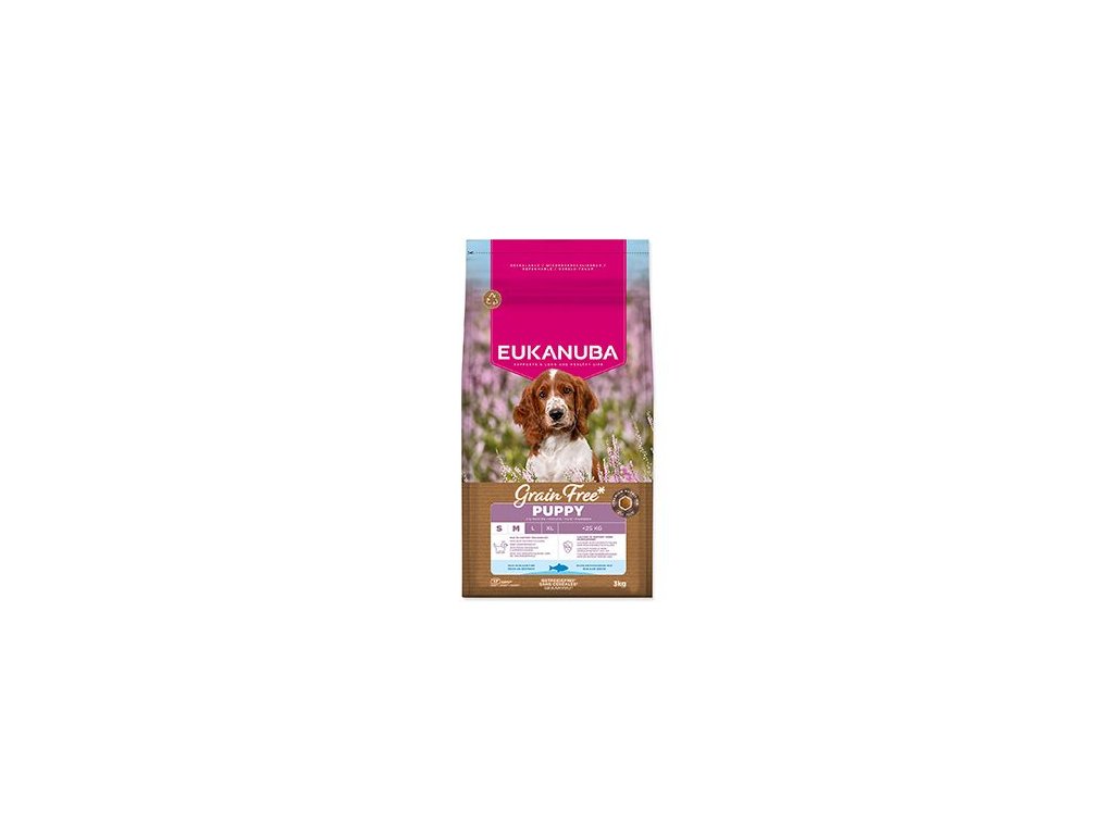 Toto suché krmivo EUKANUBA Grain Free * je speciálně vyvinuto pro štěňata malých a středně velkých plemen od 1 do 12 měsíců. Složení s nízkým obsahem alergenů a bohatým obsahem mořských ryb je pečlivě navrženo pro psy s citlivostí na obiloviny a podporuje jejich jedinečné nutriční potřeby. Složení bez kuřecího masa nabízí plnohodnotnou výživu s alternativními zdroji sacharidů, včetně hrášku a bezlepkových* sladkých brambor, které poskytují přírodní vlákninu, základní vitamíny a antioxidanty. Krmivo obsahuje mořské ryby a dodává štěněti kvalitní živočišné bílkoviny nezbytné pro budování a udržování silných a štíhlých svalů. Obsažená DHA navíc zlepšuje schopnost učení štěňat, zatímco vápník podporuje vývoj kostí. Speciálně sestavená směs vlákniny s prebiotickými fruktooligosacharidy, mannanoligosacharidy a řepnou dužinou podporuje zdravé trávení, zatímco přírodní zdroje omega-6 a omega-3 mastných kyselin podporují zdravou kůži a lesklou srst. Toto suché krmivo poskytuje štěňatům malých a středně velkých plemen pokročilou výživu, podporuje optimální tělesnou kondici a celoživotní pohodu. Krmivo EUKANUBA poskytne vašemu štěněti základ pro šťastný a zdravý život.