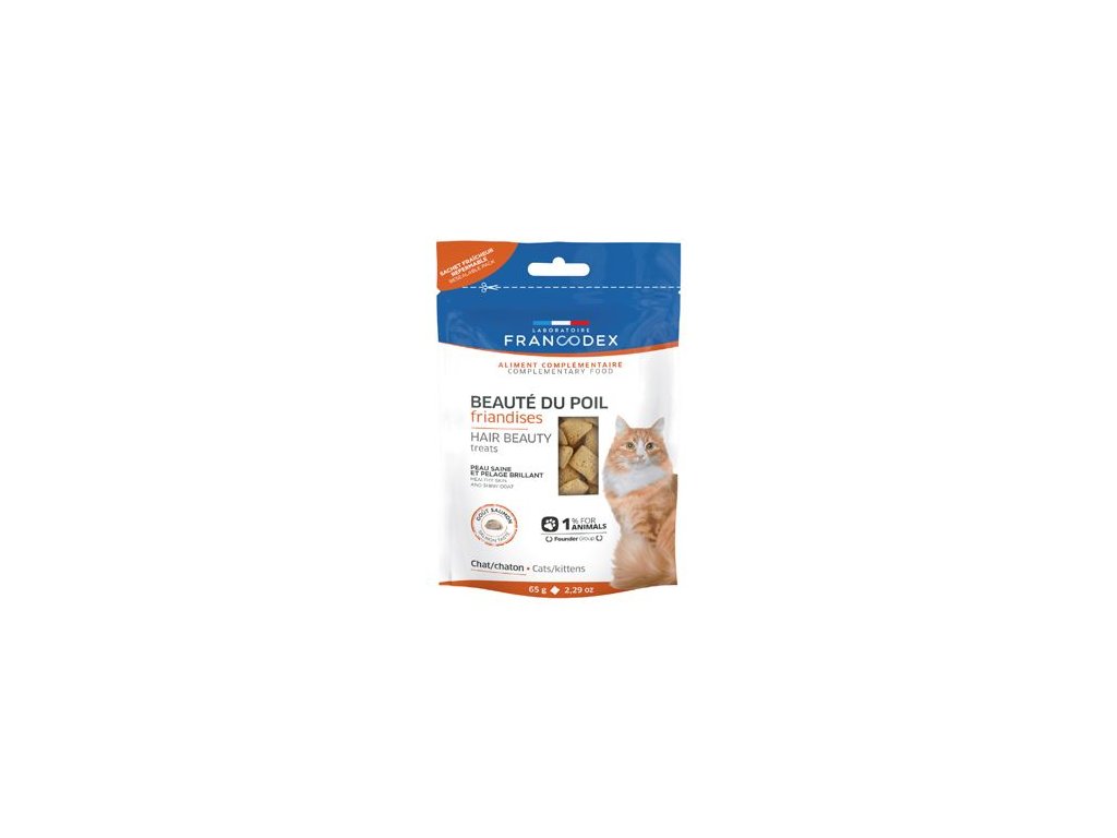 Pochoutka Francodex Hair Beauty pro kočky a koťata obsahuje vyváženou směs esenciálních mastných kyselin a vitamínů, které pomáhají zlepšit suchou, podrážděnou nebo citlivou pokožku. Bez umělých konzervačních látek a barviv. Pamlsky obsahují biotin a zinek s antioxidačními vlastnostmi, které pomáhají udržovat zdravou kůži a srst.