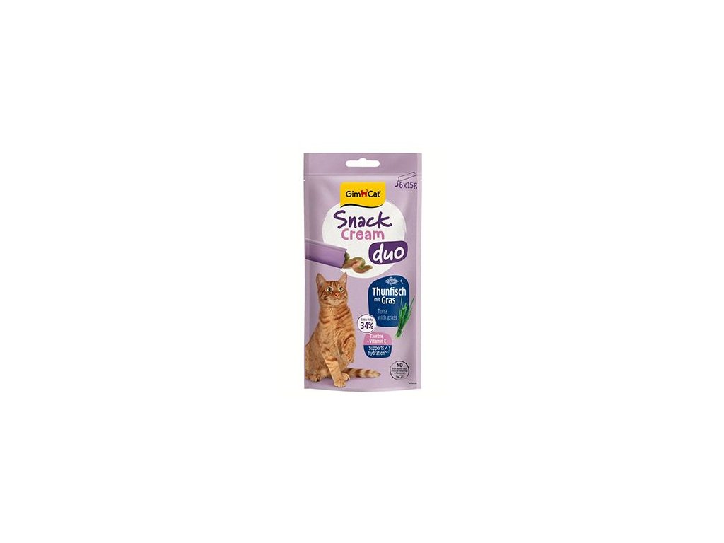 Doplňkové krmivo pro kočky, příjemná krémová pochoutka s vysokým obsahem masa z tuňáka a lahodnou trávou, balená v sáčcích po jednotlivých porcích.