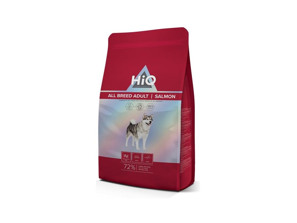 Kompletní krmivo HiQ pro dospělé psy všech plemen s lososem obsahuje vysoce kvalitní bílkoviny z lososa, které zajišťují zachování lesku a hustoty srsti a zároveň podporují zdraví pokožky. Neobsahuje pšenici a kukuřici, proto je vhodný pro psy s citlivým zažíváním nebo trpící nesnášenlivostí lepku. Krmivo napomáhá snadnému trávení a vstřebávání živin. Podporuje zdraví kostí a kloubů a dodává potřebné vitamíny a minerály. Pečuje o správné fungování srdeční činnosti a také o imunitu psa.
