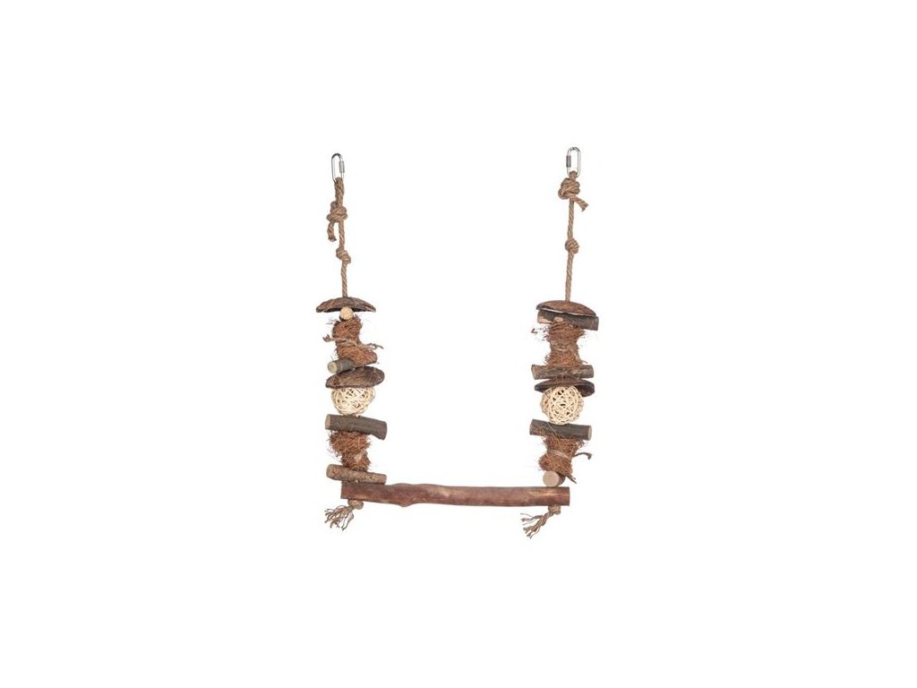 Závěsná houpačka pro malé a střední papoušky je vyrobena z topolového dřeva, kokosové skořápky, kokosového vlákna, proutěných koulí a jutového provazu. Podporuje cit pro rovnováhu, šplhání a přirozený pohyb. Je vhodná jak pro aktivní hru, tak pro odpočinek. Díky dvěma kovovým karabinkám ji lze snadno zavěsit do klece nebo voliéry. Vyrobena z odolných a bezpečných přírodních materiálů.
