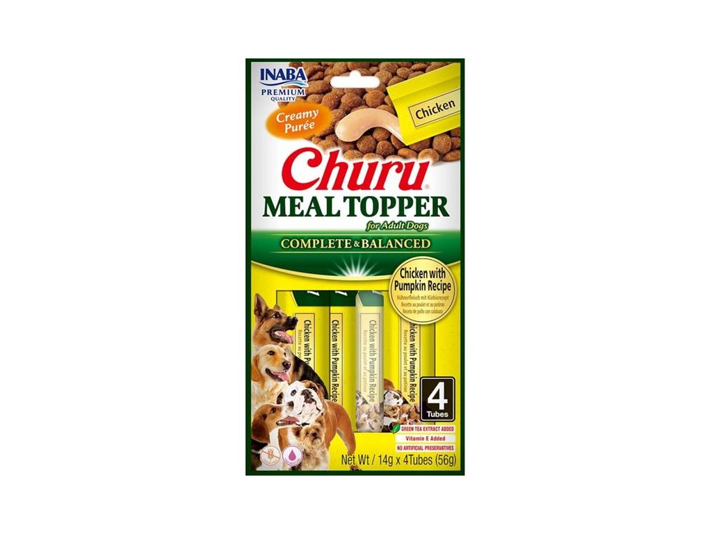 Zpestřete svému psovi suché krmivo lahodnou krémovou polevou s kuřetem a dýní. Jemné pyré Churu Meal Topper je možné používat také jako kompletní a vyvážené krmivo nebo lízací pamlsek. Je vyrobené ze surovin v kvalitě pro lidskou spotřebu, neobsahuje obiloviny, dochucovadla, konzervační látky ani umělá barviva. Má vysoký obsah vody, čímž přispívá k hydrataci organismu a celkovému zdraví psů. Navíc je obohaceno extraktem ze zeleného čaje, vitamíny a minerály.