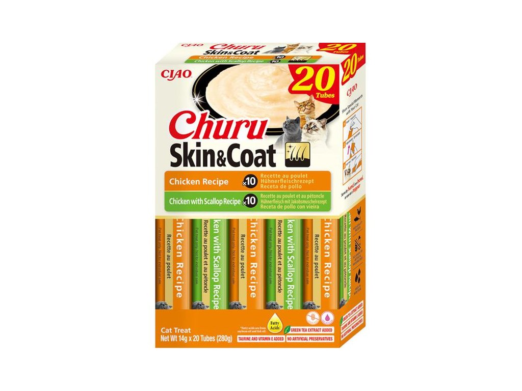 Výběr krémových pamlsků Churu Skin & Coat ve variacích s kuřetem. Krémy jsou obohacené o omega-3 a omega-6 mastné kyseliny pro zdravou kůži a krásnou srst. Jde o 100% přírodní a zdravé mlsání s nízkým obsahem kalorií, bez konzervantů, chemických aromat, barviv a umělých dochucovadel, vhodné pro kočky všech věkových kategorií. Inovativní měkká konzistence pamlsků Churu vám umožní trávit společné chvíle s vaší kočkou hravým a interaktivním způsobem. Pamlsky mají vysoký obsah vody a jsou díky tomu vhodným doplňkem k suchému krmivu nebo pro kočky, které málo pijí. Jsou také ideální pro ukrytí tablety na odčervení či jiného léku, který je potřeba kočce nenásilně podat.