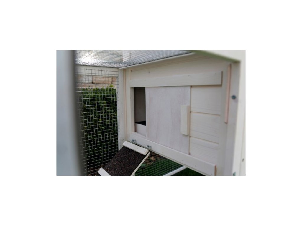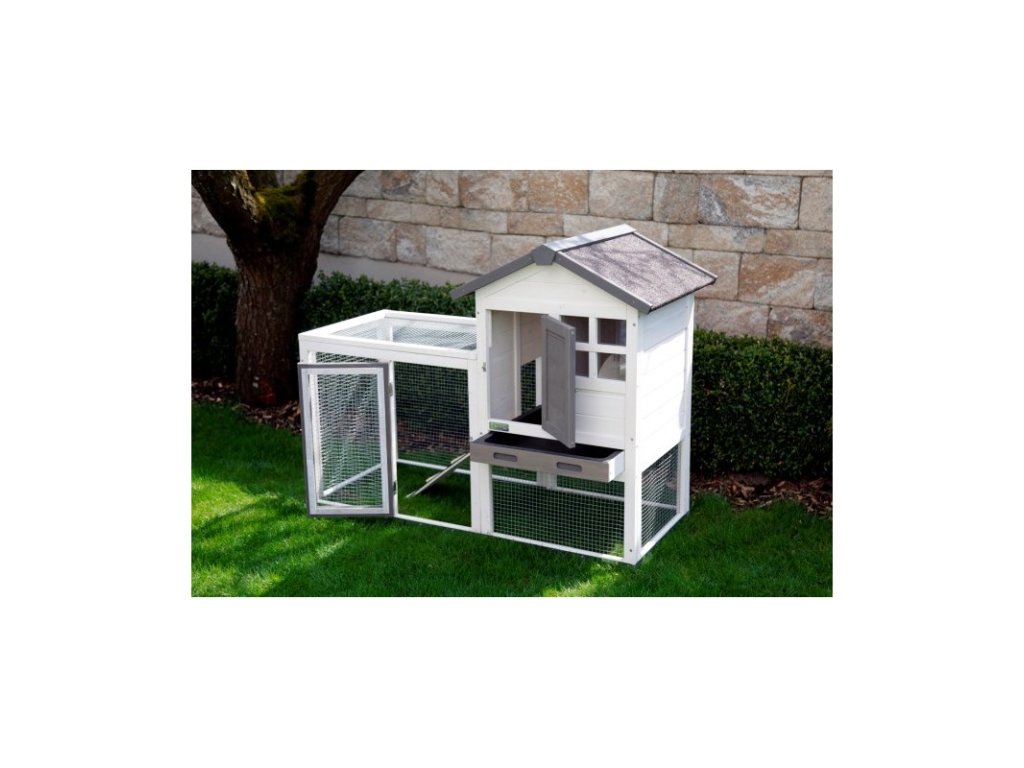 Venkovní dřevěná králíkárna s prostorným krytým výběhem pro králíky, morčata, činčily a jiné hlodavce. Elegatní provedení bílé barvy v kombinaci s moderní šedou se bude vyjímat na každé zahradě.