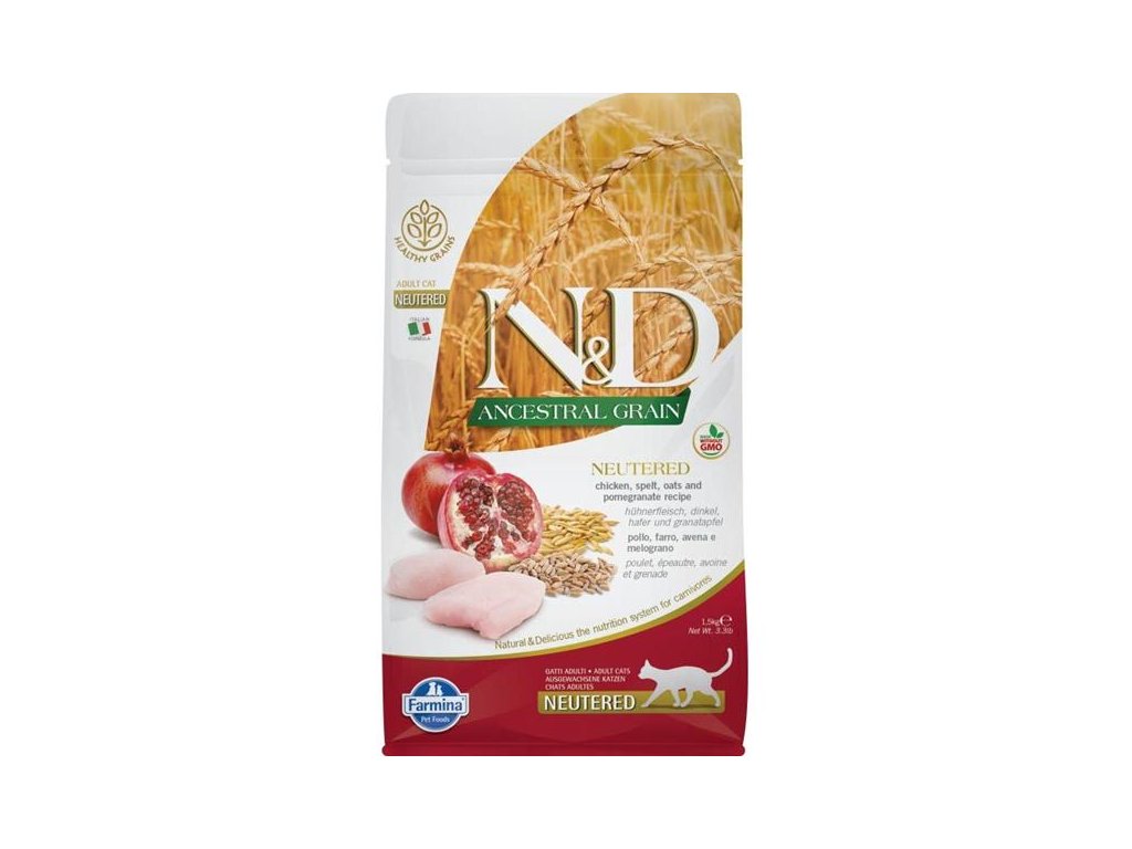 Receptura s kuřecím masem a granátovým jablkem pro kastrované dospělé kočky.