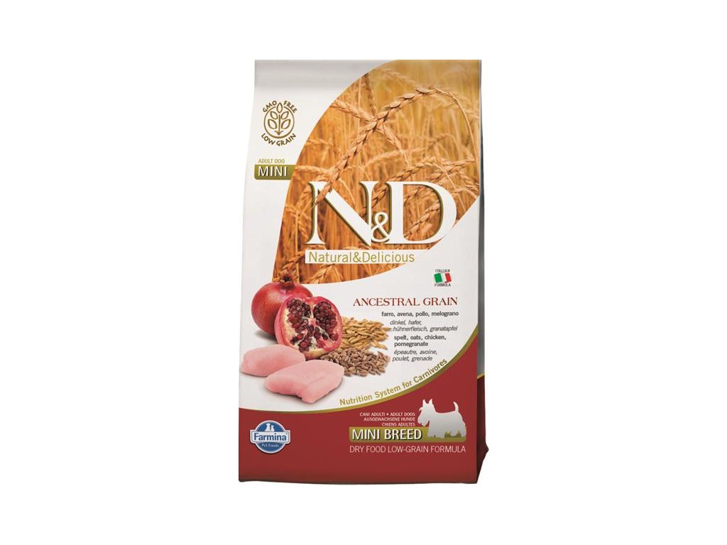Receptura s kuřecím masem a granátovým jablkem pro dospělé psy malých plemen.