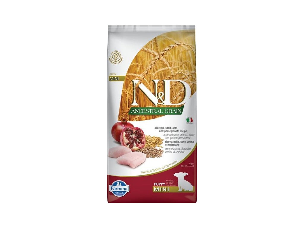 N&D Low Grain DOG Puppy Mini Chicken & Pomegranate je krmivo s kuřecím masem (40%) a granátovým jablkem pro štěňata, březí a kojící feny malých plemen. Vláknina je dodávána jen minimem obilovin (pšenice špalda) a také zeleninou a ovocem, především granátovým jablkem. Vynikající chutnost díky neobyčejné kombinaci velice kvalitních surovin.