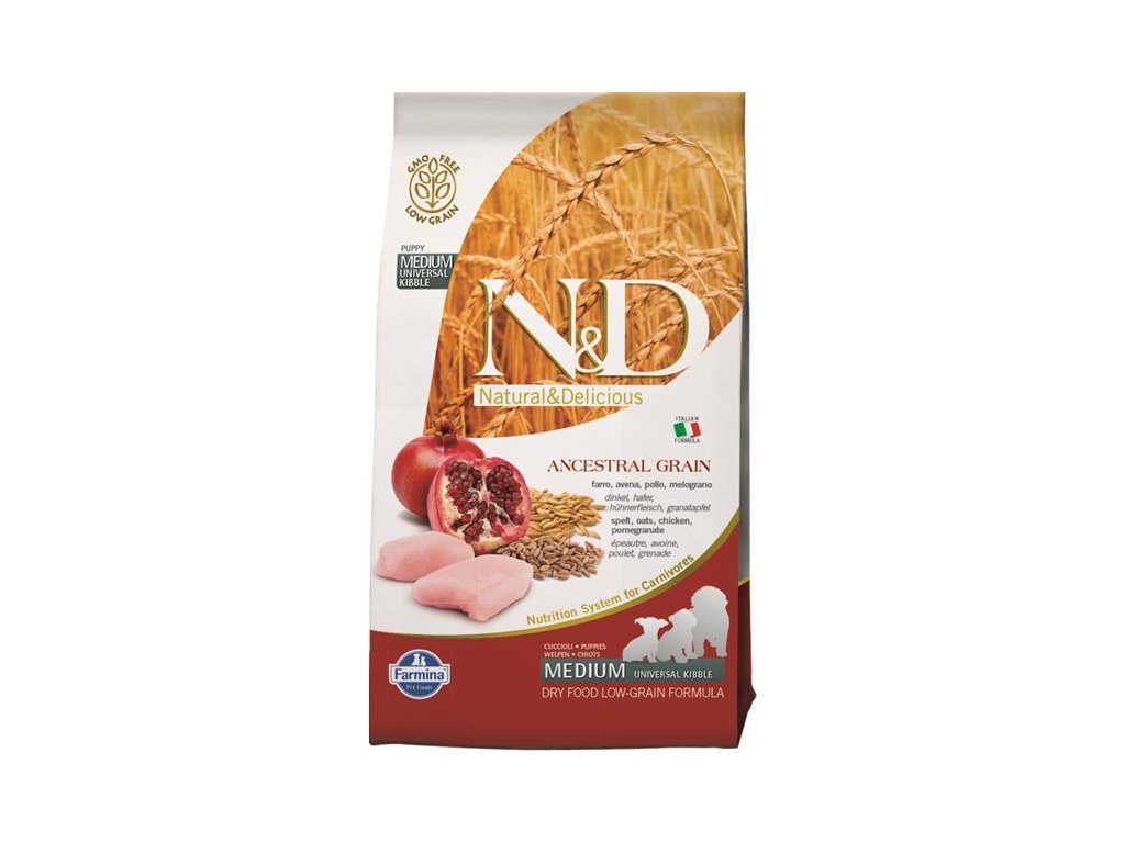 Receptura s kuřecím masem a granátovým jablkem pro štěňata, březí a kojící feny středních plemen.