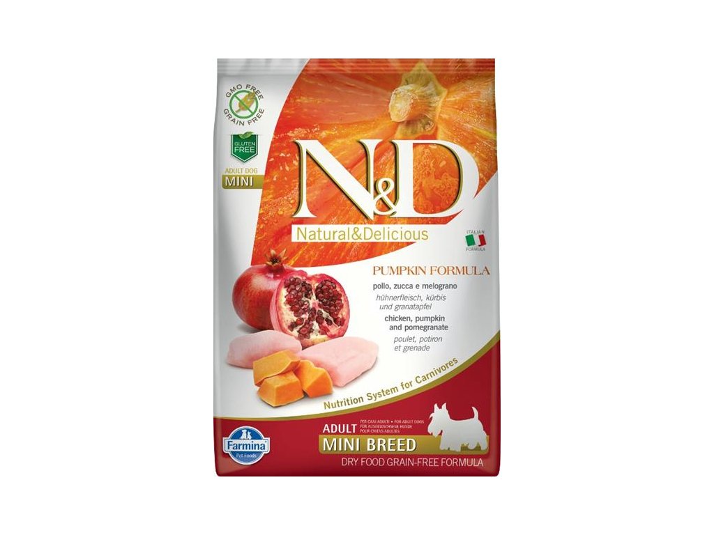 Receptura s kuřecím masem, dýní a granátovým jablkem pro dospělé psy malých plemen.