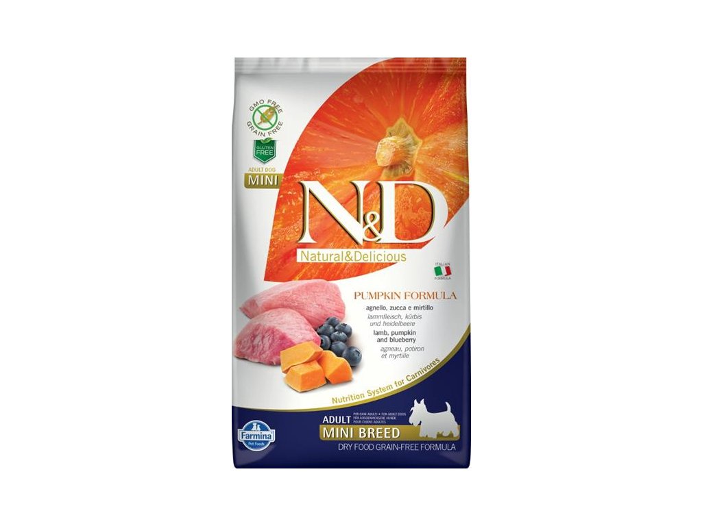 Receptura s jehněčím, dýní a borůvkami pro dospělé psy malých plemen.