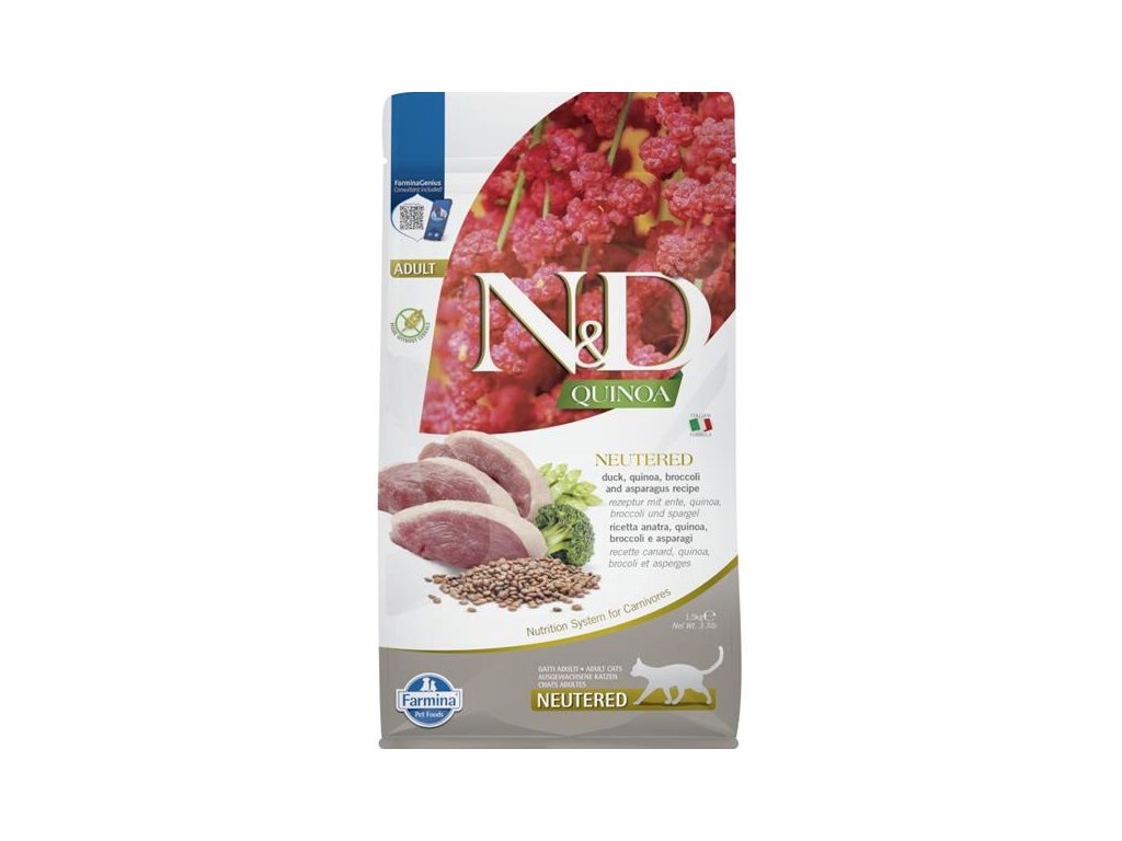 Vyvážené krmivo pro kastrované kočky obsahuje 91 % proteinů živočišného původu, nízký obsah tuku a vysoký podíl vlákniny. Hlavním zdrojem vysoce kvalitních bílkovin je kachní maso. Přidaná superpotravina quinoa obsahuje cca 13 % bílkovin s vysokou biologickou hodnotou a všechny esenciální aminokyseliny ve vyváženém poměru (ve světě rostlin velmi vzácné). Rybí olej zaručuje optimální poměr omega-3 a omega-6 mastných kyselin pro dobrou kondici kůže a srsti a jejich regenerační schopnost. Přidaný glukosamin a chondroitin vyživují kloubní chrupavky a stimulují růst a regeneraci kloubních tkání. Krmivo neobsahuje obiloviny, geneticky modifikované suroviny, umělá barviva, bílkoviny ze sóji ani hormonální nebo antibiotická rezidua.
