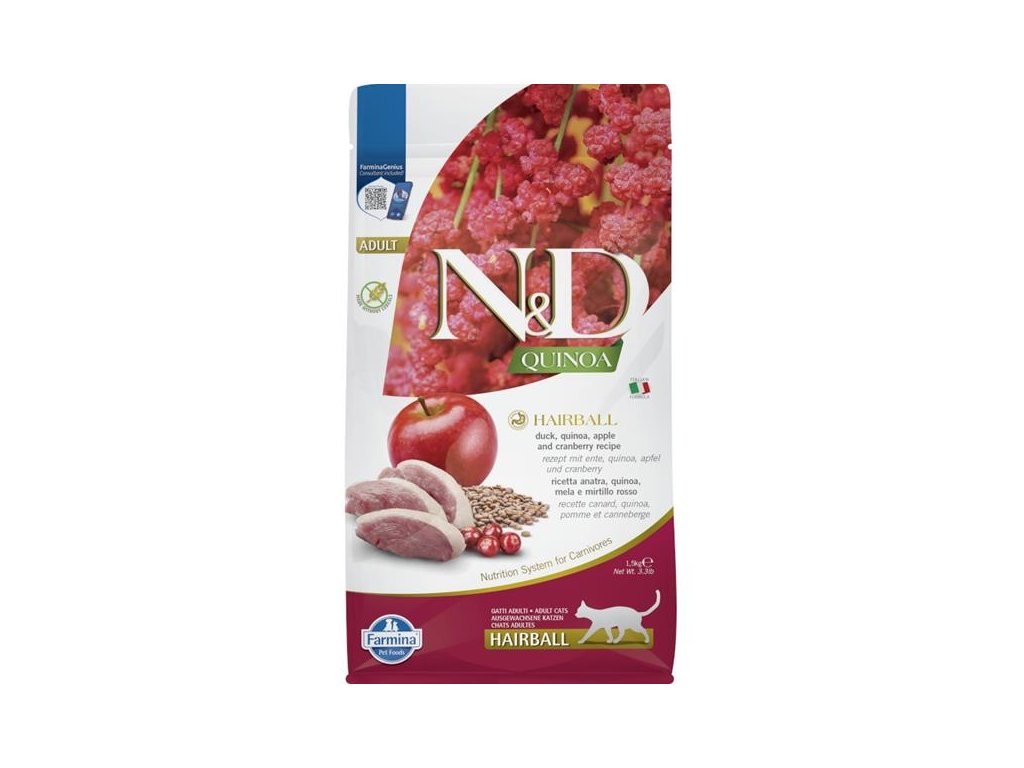 Vyvážené funkční krmivo pro dospělé kočky určené k usnadnění vstřebání trichobezoárů. Hlavním zdrojem vysoce kvalitních bílkovin je hypoalergenní kachní maso. Přidaná superpotravina quinoa obsahuje cca 13 % bílkovin s vysokou biologickou hodnotou a všechny esenciální aminokyseliny ve vyváženém poměru (ve světě rostlin velmi vzácné). Rybí olej zaručuje optimální poměr omega-3 a omega-6 mastných kyselin pro dobrou kondici kůže a srsti a jejich regenerační schopnost. Přidaný glukosamin a chondroitin vyživují kloubní chrupavky a stimulují růst a regeneraci kloubních tkání. Krmivo neobsahuje obiloviny, geneticky modifikované suroviny, umělá barviva, bílkoviny ze sóji ani hormonální nebo antibiotická rezidua.