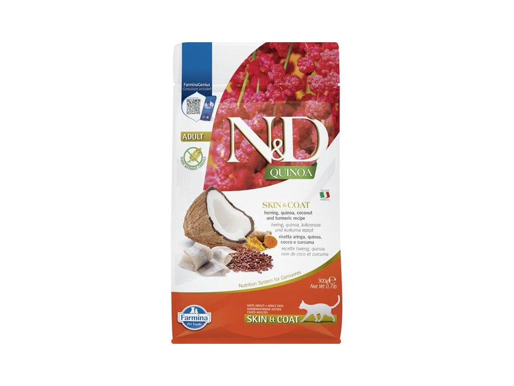 Vyvážené funkční krmivo je určené pro dospělé kočky při nežádoucí reakci na potravu pro navrácení a udržení zdraví kůže a srsti. Hlavním zdrojem vysoce kvalitních bílkovin v krmivu je hypoalergenní sleď. Přidaná quinoa v bio kvalitě pěstovaná v Itálii podporuje trávení, absorpci živin a celkově zdraví trávicího traktu. Dále je bohatá na vzácné aminokyseliny a přírodní antioxidanty a má nízký glykemický index. Rybí olej zaručuje optimální poměr omega-3 a omega-6 mastných kyselin pro dobrou kondici kůže a srsti a jejich regenerační schopnost. Přídavek glukosaminu a chondroitinu vyživuje kloubní chrupavky, stimuluje růst a ochraňuje klouby. Krmivo neobsahuje obiloviny, geneticky modifikované suroviny, umělá barviva, bílkoviny ze sóji ani hormonální nebo antibiotická rezidua.
