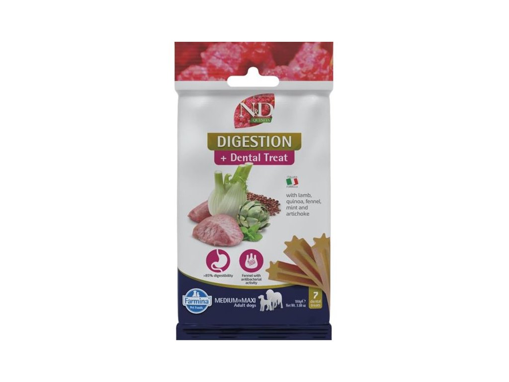 Kolem 80 % dospělých psů čelí problémům v dutině ústní. Parodontální onemocnění je navíc spojeno s vyšším rizikem srdečních a ledvinových problémů. Předcházejte těmto potížím s pomocí dentálních tyčinek N&D Quinoa Digestion Dental Treat určených pro psy a štěňata (od 4 měsíců) středních a velkých plemen s citlivým zažíváním. Quinoa podporuje trávení, absorpci živin a celkově zdraví trávicího traktu. Fenykl je známý svými antibakteriálními vlastnostmi.