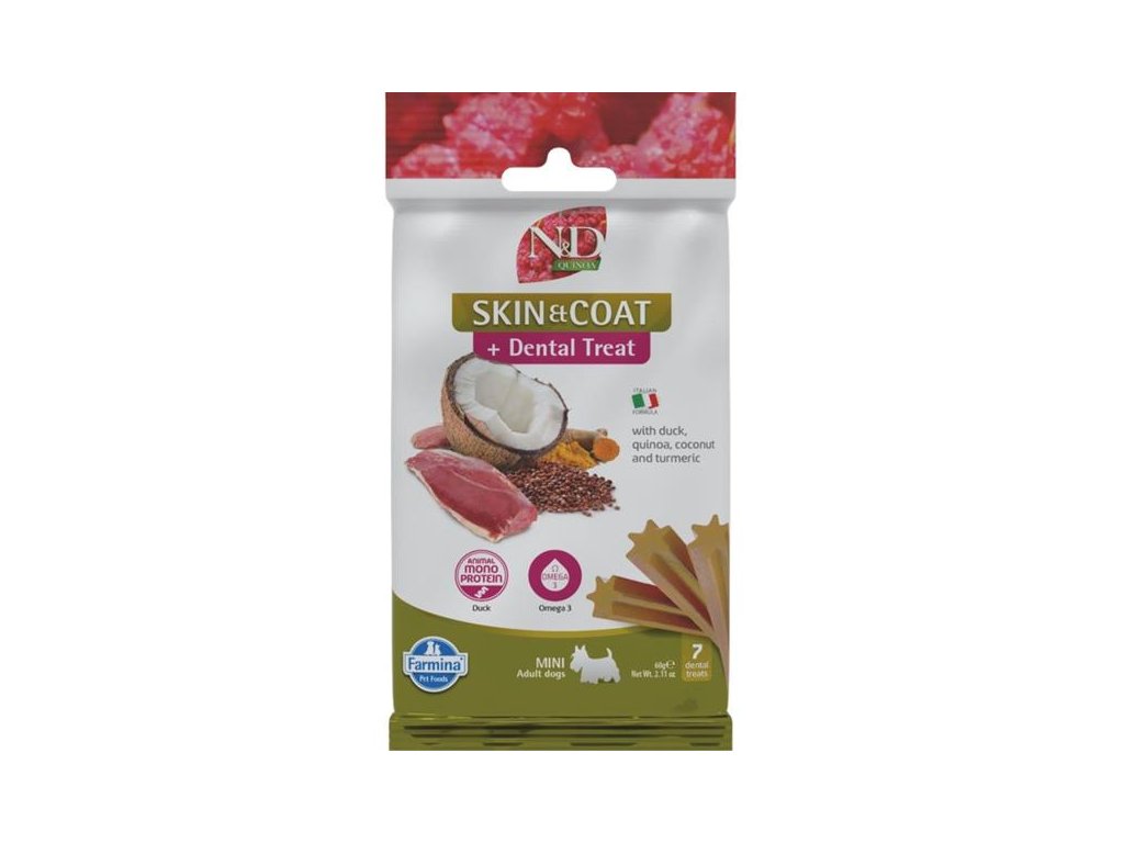Kolem 80 % dospělých psů čelí problémům v dutině ústní. Parodontální onemocnění je navíc spojeno s vyšším rizikem srdečních a ledvinových problémů. Předcházejte těmto potížím s pomocí dentálních tyčinek N&D Quinoa Skin & Coat Dental Treat určených pro psy a štěňata (od 4 měsíců) malých plemen. Quinoa podporuje trávení, absorpci živin a celkově zdraví trávicího traktu. Omega-3 a omega-6 mastné kyseliny podporují zdraví kůže a lesk srsti.