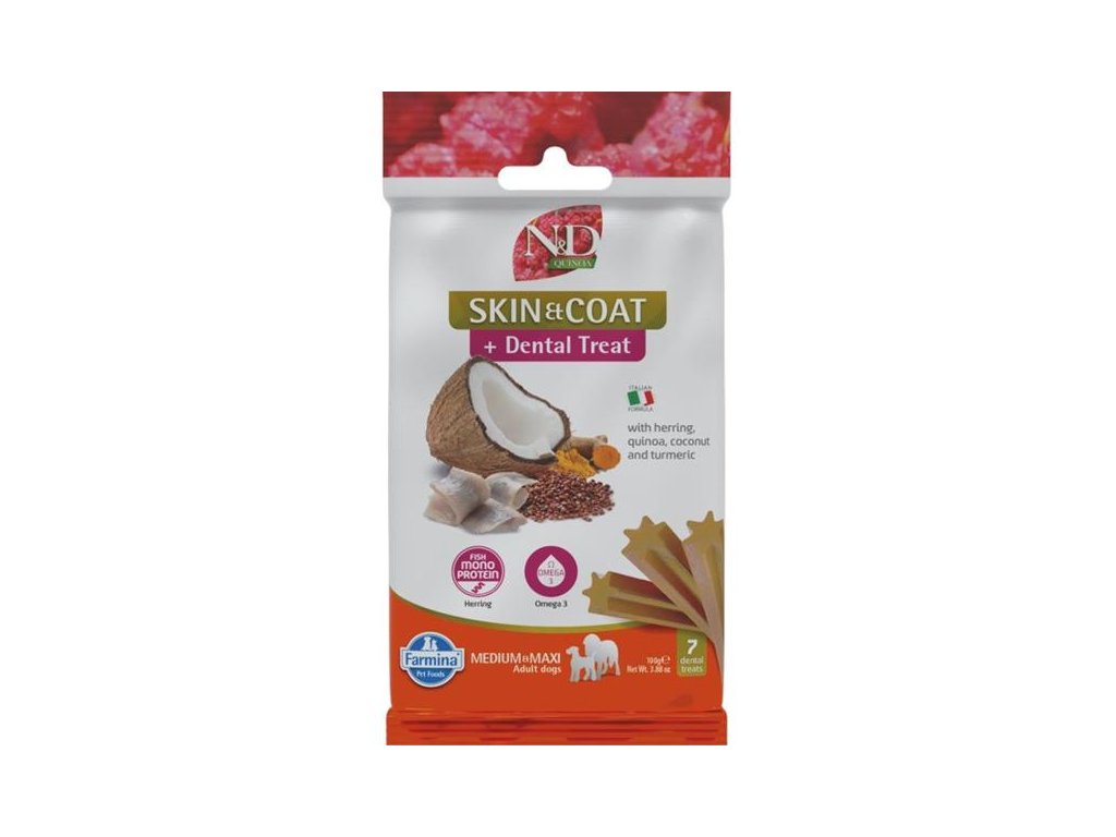 Kolem 80 % dospělých psů čelí problémům v dutině ústní. Parodontální onemocnění je navíc spojeno s vyšším rizikem srdečních a ledvinových problémů. Předcházejte těmto potížím s pomocí dentálních tyčinek N&D Quinoa Skin & Coat Dental Treat určených pro psy a štěňata (od 4 měsíců) středních a velkých plemen. Quinoa podporuje trávení, absorpci živin a celkově zdraví trávicího traktu. Omega-3 a omega-6 mastné kyseliny podporují zdraví kůže a lesk srsti.