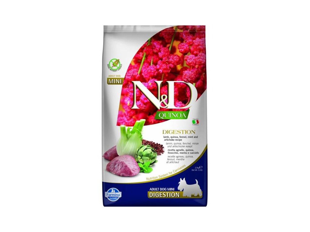 Vyvážené funkční krmivo pro dospělé psy malých plemen podporuje zdravý trávicí trakt. Hlavním zdrojem vysoce kvalitních bílkovin v krmivu je hypoalergenní jehněčí maso. Přidaná quinoa v bio kvalitě pěstovaná v Itálii podporuje trávení, absorpci živin a celkově zdraví trávicího traktu. Dále je bohatá na vzácné aminokyseliny a přírodní antioxidanty a má nízký glykemický index. Rybí olej zaručuje optimální poměr omega-3 a omega-6 mastných kyselin pro dobrou kondici kůže a srsti a její regenerační schopnost. Přídavek glukosaminu a chondroitinu vyživuje kloubní chrupavky, stimuluje růst a ochraňuje klouby. Krmivo neobsahuje obiloviny, geneticky modifikované suroviny, umělá barviva, bílkoviny ze sóji, hormonální ani antibiotická rezidua.