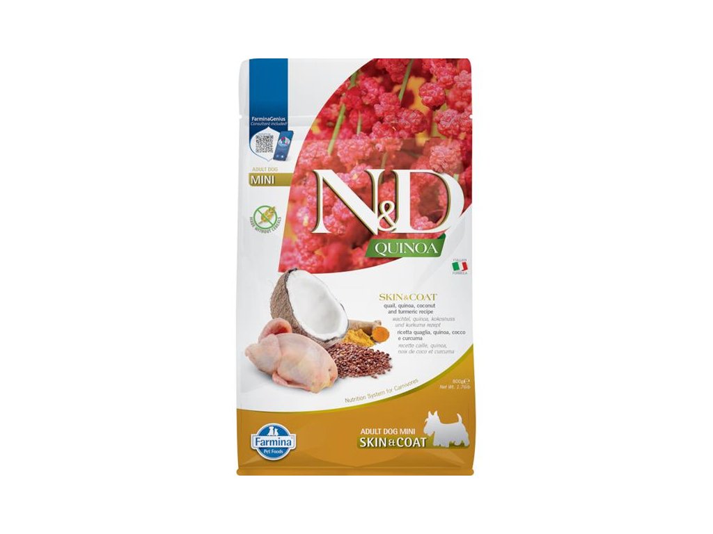 Vyvážené funkční krmivo pro dospělé psy malých plemen při nežádoucí reakci na potravu pro navrácení a udržení zdraví kůže a srsti. Hlavním zdrojem vysoce kvalitních bílkovin v krmivu je hypoalergenní křepelka. Přidaná quinoa v bio kvalitě pěstovaná v Itálii podporuje trávení, absorpci živin a celkově zdraví trávicího traktu. Dále je bohatá na vzácné aminokyseliny a přírodní antioxidanty a má nízký glykemický index. Rybí olej zaručuje optimální poměr omega-3 a omega-6 mastných kyselin pro dobrou kondici kůže a srsti a její regenerační schopnost. Přídavek glukosaminu a chondroitinu vyživuje kloubní chrupavky, stimuluje růst a ochraňuje klouby. Krmivo neobsahuje obiloviny, geneticky modifikované suroviny, umělá barviva, bílkoviny ze sóji, hormonální ani antibiotická rezidua.