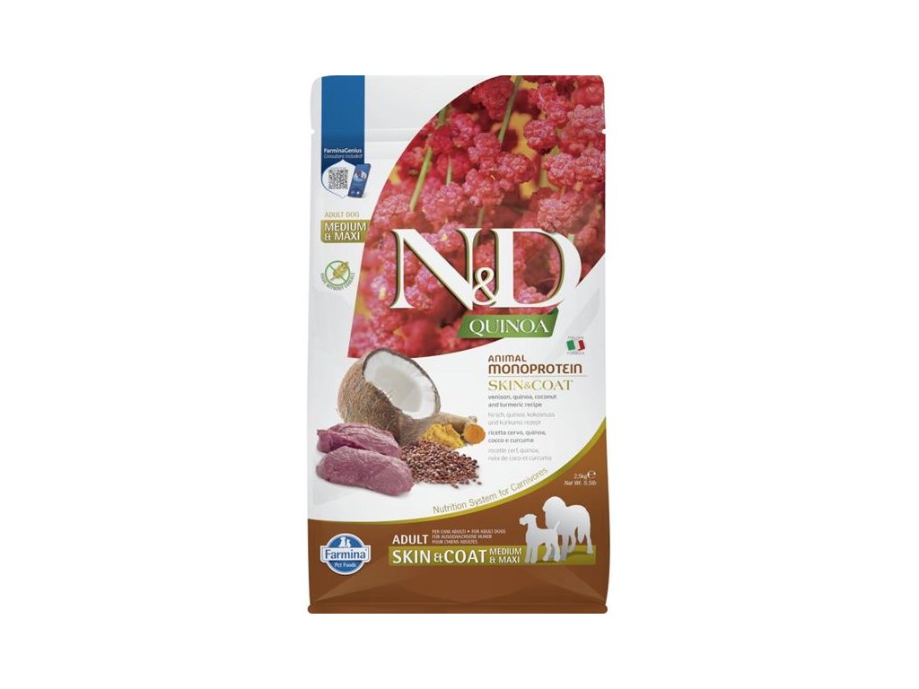 Vyvážené funkční krmivo je určené pro dospělé psy středních a velkých plemen při nežádoucí reakci na potravu pro navrácení a udržení zdraví kůže a srsti. Hlavním zdrojem vysoce kvalitních bílkovin v krmivu je hypoalergenní zvěřina. Přidaná quinoa v bio kvalitě pěstovaná v Itálii podporuje trávení, absorpci živin a celkově zdraví trávicího traktu. Dále je bohatá na vzácné aminokyseliny a přírodní antioxidanty a má nízký glykemický index. Rybí olej zaručuje optimální poměr omega-3 a omega-6 mastných kyselin pro dobrou kondici kůže a srsti a jejich regenerační schopnost. Přídavek glukosaminu a chondroitinu vyživuje kloubní chrupavky, stimuluje růst a ochraňuje klouby. Krmivo neobsahuje obiloviny, geneticky modifikované suroviny, umělá barviva, bílkoviny ze sóji ani hormonální nebo antibiotická rezidua.
