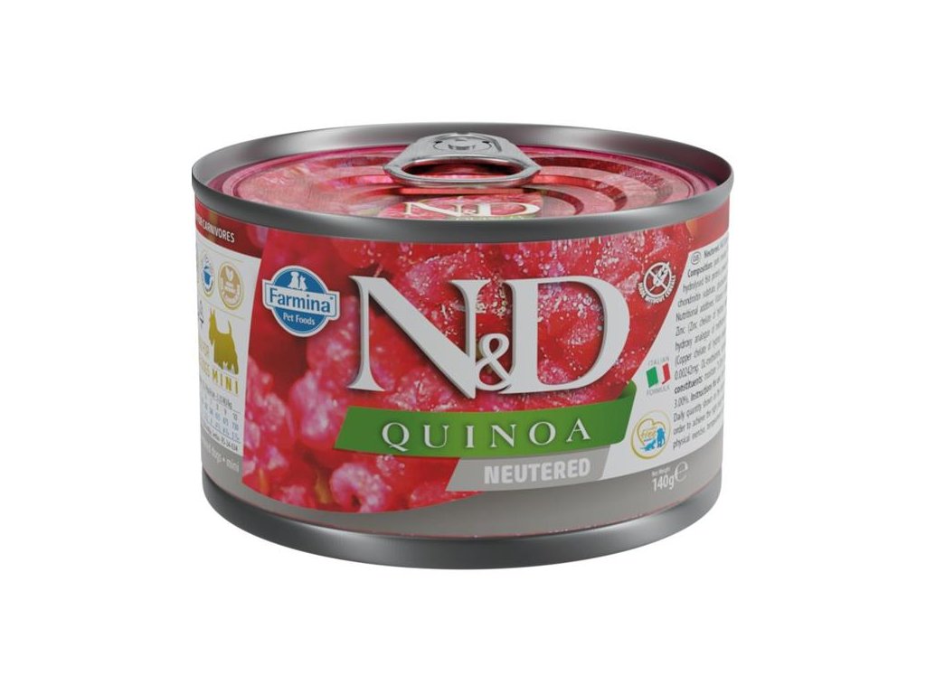 Kompletní vlhké krmivo je určené pro dospělé kastrované psy malých plemen. Hlavním zdrojem vysoce kvalitních bílkovin je vepřové maso (plec a koleno). Přidaná quinoa v bio kvalitě pěstovaná v Itálii podporuje trávení, absorpci živin a celkově zdraví trávicího traktu. Dále je bohatá na vzácné aminokyseliny a přírodní antioxidanty a má nízký glykemický index. Rybí olej zaručuje optimální poměr omega-3 a omega-6 mastných kyselin pro dobrou kondici kůže a srsti a její regenerační schopnost. Přidaný glukosamin a chondroitin vyživují kloubní chrupavky a stimulují růst a regeneraci kloubních tkání. Krmivo neobsahuje obiloviny, geneticky modifikované suroviny, umělá barviva, bílkoviny ze sóji ani hormonální nebo antibiotická rezidua.