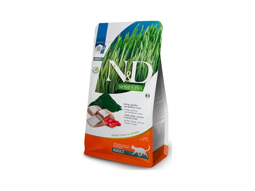 Vyvážené krmivo pro aktivní dospělé kočky obsahuje více než 90 % bílkovin živočišného původu. Hlavním zdrojem vysoce kvalitních bílkovin je hypoalergenní sleď. Přidaná superpotravina spirulina je zdrojem mastných kyselin, vitamínů a minerálů. Díky svým silným antioxidačním účinkům má pozitivní vliv na trávení, imunitní systém a kvalitu srsti a kůže. Napomáhá také ke správnému metabolismu tuků a sacharidů, díky čemuž má pozitivní vliv na udržení štíhlé postavy. Rybí olej zaručuje optimální poměr omega-3 a omega-6 mastných kyselin pro dobrou kondici kůže a srsti a její regenerační schopnost. Působí také protizánětlivě a stimulují imunitní systém. Krmivo neobsahuje obiloviny, geneticky modifikované suroviny, umělá barviva, bílkoviny ze sóji, hormonální ani antibiotická rezidua.