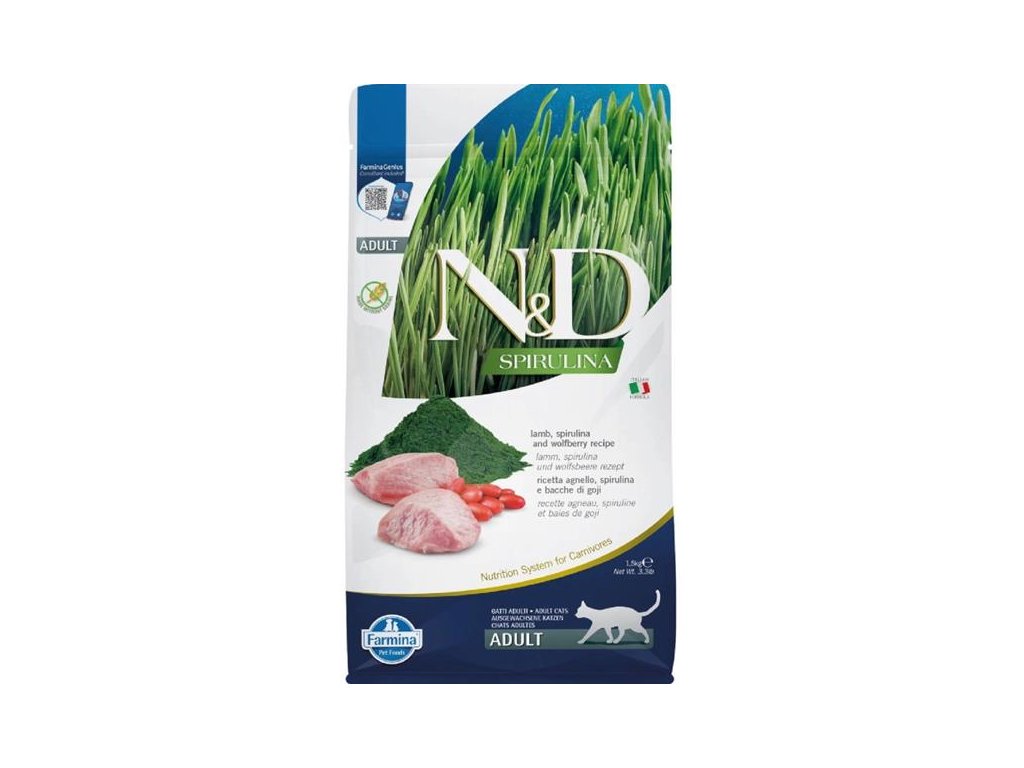 Vyvážené grain-free krmivo pro aktivní dospělé kočky obsahuje 96 % bílkovin živočišného původu. Hlavním zdrojem vysoce kvalitních bílkovin je hypoalergenní jehněčí. Přidaná superpotravina spirulina je zdrojem mastných kyselin, vitamínů a minerálů. Díky svým silným antioxidačním účinkům má pozitivní vliv na trávení, imunitní systém a kvalitu srsti a kůže. Napomáhá také správnému metabolismu tuků a sacharidů, díky čemuž přispívá k udržení zdravé tělesné hmotnosti. Rybí olej zaručuje optimální poměr omega-3 a omega-6 mastných kyselin, které podporují kondici kůže a srsti a jejich regenerační schopnost, působí protizánětlivě a stimulují imunitní systém. Krmivo neobsahuje obiloviny, geneticky modifikované suroviny, umělá barviva, bílkoviny ze sóji a hormonální ani antibiotická rezidua.