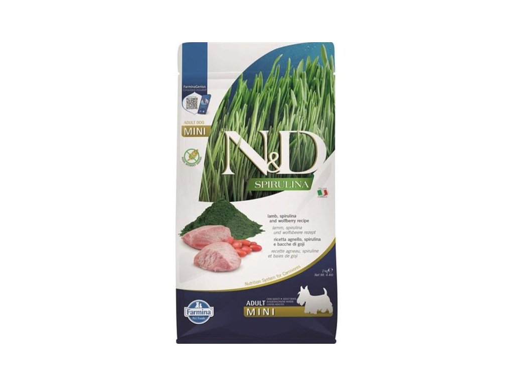 Vyvážené kompletní krmivo pro dospělé aktivní psy malých plemen obsahuje 96 % proteinů živočišného původu. Hlavním zdrojem vysoce kvalitních bílkovin je hypoalergenní jehněčí maso. Přidaná superpotravina spirulina je zdrojem mastných kyselin, vitamínů a minerálů. Díky svým silným antioxidačním účinkům má pozitivní vliv na trávení, imunitní systém a kvalitu srsti a kůže. Napomáhá také ke správnému metabolismu tuků a sacharidů, díky čemuž má pozitivní vliv na udržení štíhlé postavy. Rybí olej zaručuje optimální poměr omega-3 a omega-6 mastných kyselin pro dobrou kondici kůže a srsti a její regenerační schopnost. Přidaný glukosamin a chondroitin vyživují kloubní chrupavky a stimulují růst a regeneraci kloubních tkání. Krmivo neobsahuje obiloviny, geneticky modifikované suroviny, umělá barviva, bílkoviny ze sóji ani hormonální nebo antibiotická rezidua.