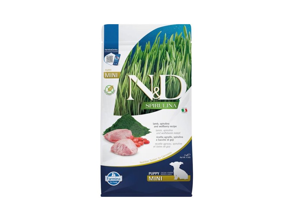 Vyvážené kompletní bezobilné krmivo pro štěňata malých plemen obsahuje 96 % proteinů živočišného původu. Hlavním zdrojem vysoce kvalitních bílkovin je hypoalergenní jehněčí maso. Přidaná superpotravina spirulina je zdrojem mastných kyselin, vitamínů a minerálů. Díky svým silným antioxidačním účinkům má pozitivní vliv na trávení, imunitní systém a kvalitu srsti a kůže. Napomáhá také ke správnému metabolismu tuků a sacharidů, díky čemuž přispívá k udržení štíhlé postavy. Rybí olej zaručuje optimální poměr omega-3 a omega-6 mastných kyselin pro dobrou kondici kůže a srsti a jejich regenerační schopnost. Přidaný glukosamin a chondroitin vyživují kloubní chrupavky a stimulují růst a regeneraci kloubních tkání. Krmivo neobsahuje obiloviny, geneticky modifikované suroviny, umělá barviva, bílkoviny ze sóji ani hormonální nebo antibiotická rezidua.