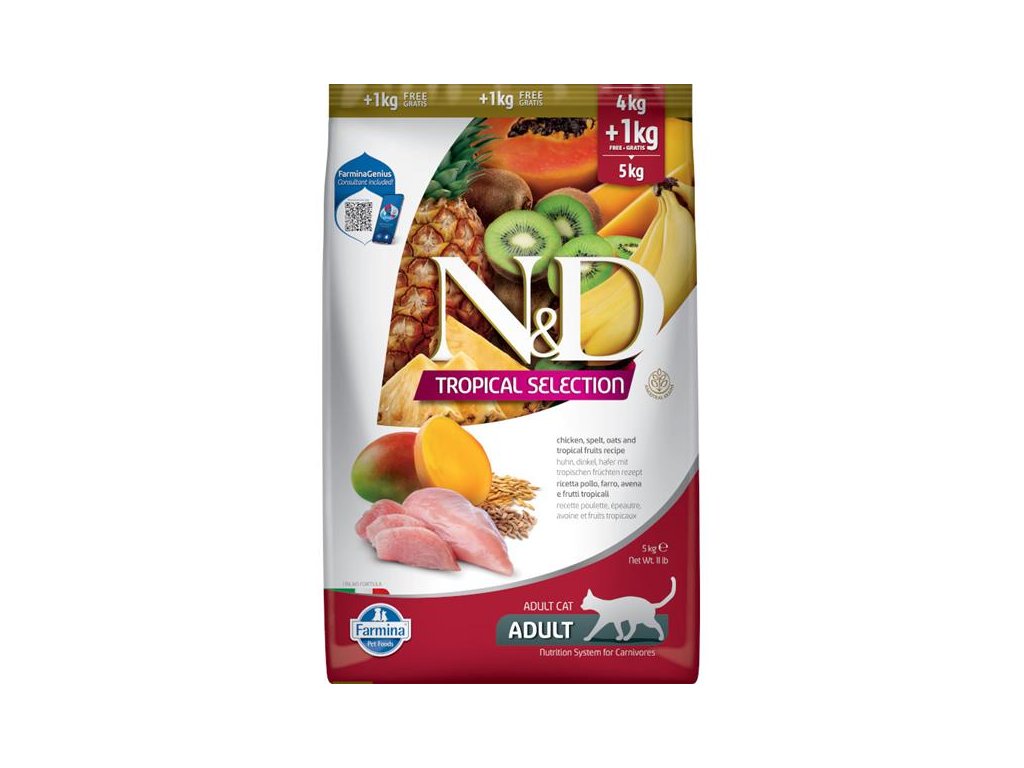 Kompletní nízkoobilné krmivo s kuřecím masem a tropickým ovocem pro dospělé kočky. Řada N&D Tropical selection v sobě kombinuje kvalitní zdroje živočišných bílkovin, vysoce kvalitní obiloviny a chutné tropické ovoce pro nasycení vašeho zvířecího kamaráda.