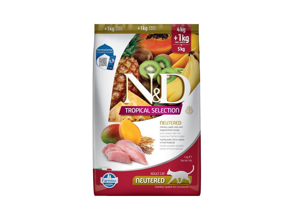 Kompletní nízkoobilné krmivo s kuřecím masem a tropickým ovocem pro dospělé kastrované kočky. Řada N&D Tropical selection v sobě kombinuje kvalitní zdroje živočišných bílkovin, vysoce kvalitní obiloviny a chutné tropické ovoce pro nasycení vašeho zvířecího kamaráda.