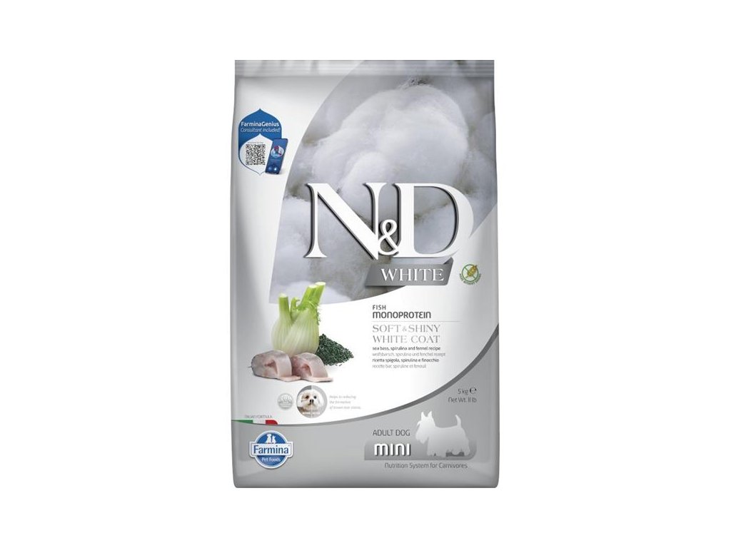 Vyvážené kompletní krmivo pro dospělé psy malých plemen pro zvýraznění bílého pigmentu. Krmivo přispívá k potlačování vzniku skvrn díky obsahu proteinů s vysokou biologickou hodnotou, omezenému obsahu fenylalaninu a tyrosinu a sníženému obsahu mědi a omega-3 mastných kyselin. Hlavním zdrojem vysoce kvalitních bílkovin v krmivu je hypoalergenní mořský vlk ze Středozemního moře. Přidaná superpotravina spirulina je zdrojem mastných kyselin, vitamínů a minerálů. Díky svým silným antioxidačním účinkům má pozitivní vliv na trávení, imunitní systém a kvalitu srsti a kůže. Napomáhá také ke správnému metabolismu tuků a sacharidů, díky čemuž má pozitivní vliv na udržení štíhlé postavy. Rybí olej zaručuje optimální poměr omega-3 a omega-6 mastných kyselin pro dobrou kondici kůže a srsti a jejich regenerační schopnost. Přidaný glukosamin a chondroitin vyživují kloubní chrupavky a stimulují růst a regeneraci kloubních tkání. Krmivo neobsahuje obiloviny, geneticky modifikované suroviny, umělá barviva, bílkoviny ze sóji ani hormonální nebo antibiotická rezidua.