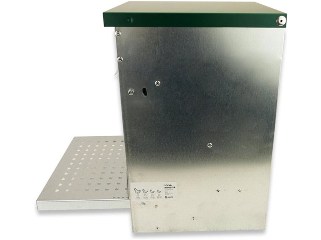 Nášlapné krmítko pro slepice, drůbež, 20 kg krmiva, do 50 slepic, automatické, odolné, snadno omyvatelný pozinkovaný povrch. Pokud hledáte kvalitní automatické jednostranné nášlapné krmítko, pak nemůžete vybrat lépe. Drůbež bude mít po celý den dostatečný přístup k čistému a čerstvému krmivu a Vaším úkolem přitom bude pouze nasypání krmiva do zásobníku. Víko zásobníku má madlo pro snadnější otevření tohoto samokrmítka. Když si slepice stoupne na nášlapnou plošinu, mechanismus otevře víko a zpřístupní jí krmení. Po seskočení z plošiny se krmítko opět uzavře. Nášlapné krmítko pro slepice je vyrobeno ze silného pozinkovaného plechu, a proto bude jeho čištění a údržba opravdu snadná. Rozměry: 450 x 470 x 420 mm.
