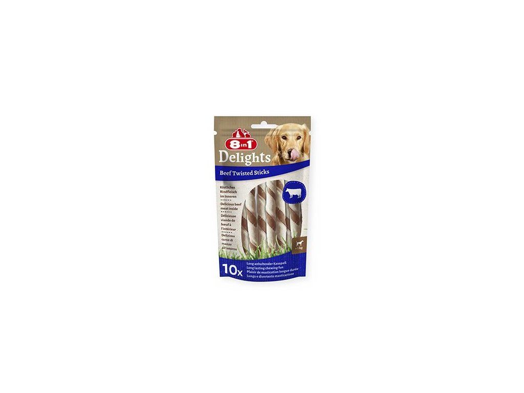 8in1 Delights hovězí kroucené tyčinky jsou vyrobeny z chutné hovězí kůže a lahodného hovězího masa. Zajišťují intenzivní, dlouhotrvající potěšení ze žvýkání pro vašeho psa. A co víc: kroucené tyčinky psa zaměstnají a zároveň zlepšují péči o zuby. Díky přirozenému obrušování při žvýkání se ze zubů odstraňuje zubní kámen a kroucené tyčinky tak podporují zdraví zubů vašeho psa. 8in1 Delights hovězí kroucené tyčinky s nízkým obsahem tuku dokonale poslouží jako lahodná žvýkací pochoutka, kterou svého psa odměníte. Jsou bohaté na proteiny a bez umělých barviv a dochucovadel. Do žvýkacích pochoutek pečených v troubě se navíc nepřidává cukr, GMO, lepek a obiloviny.