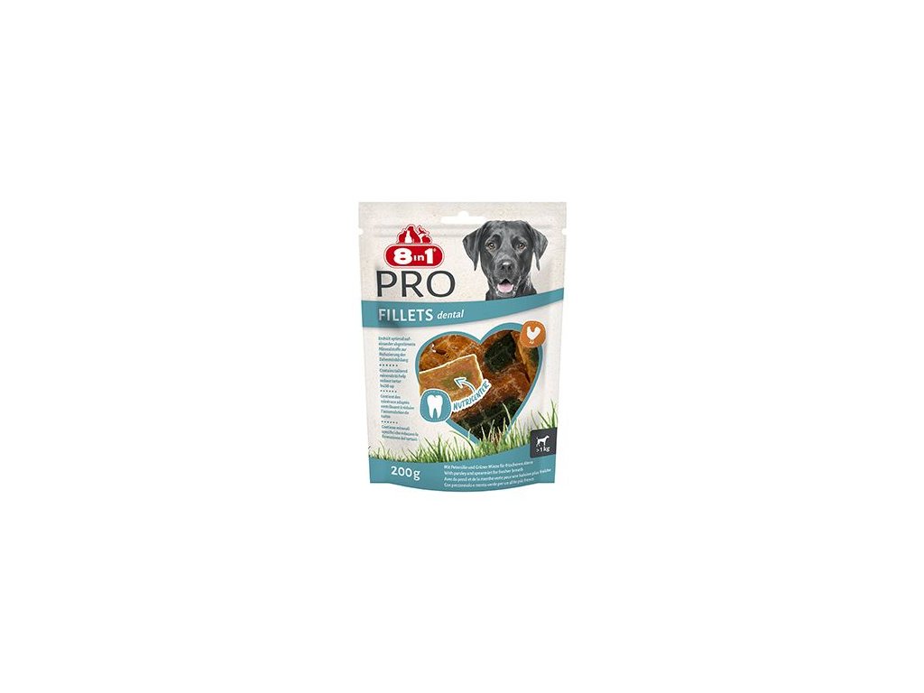 Pamlsky 8in1 Fillets Pro Dental jsou lahodné pamlsky prémiové kvality, které navíc osvěžují dech. Pamlsky 8in1 Fillets Pro nejsou jen mimořádně chutné, ale navíc jsou pro vašeho psa lahodnou pochoutkou s přidanou hodnotou. Skládají se z chutných kuřecích prsou se speciální výživnou náplní Nutri-Centre, která obsahuje zdravé a funkční přidané složky podporující pohodu a vitalitu psa. Jedinečná náplň Nutri-Centre obsahuje speciálně přizpůsobené minerály, které omezují tvorbu zubního kamene, a je obohacena o petržel a mátu peprnou pro svěžejší dech. 8in1 Fillets Pro Dental mají nízký obsah tuku a vysoký obsah bílkovin, takže jsou skvělou zdravou odměnou mezi krmením. Navíc jsou vyrobeny bez umělých dochucovadel a konzervačních látek. Uzavíratelný sáček zajistí delší čerstvost a vy si pamlsky můžete snadno vzít s sebou, když jste na cestách.