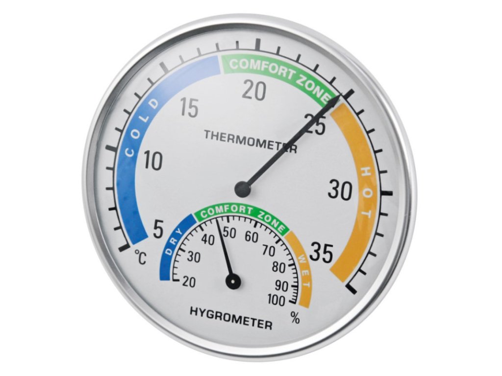 Kvalitní a přesný analogový teploměr a vlhkoměr používaný především ve stájích.