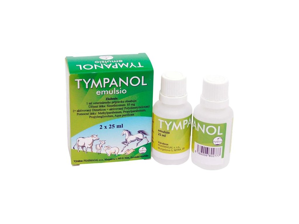 Tympanol je přípravek s obsahem polydimetylsiloxanu, aktivovaného koloidním oxidem křemičitým ve formě emulze jako účinný prostředek při plynatosti a jako odpěnovací prostředek, založený na rozrušování pěny ovlivňováním povrchového napětí. Způsobuje splývání plynových bublinek a ulehčuje tak odchod plynů.