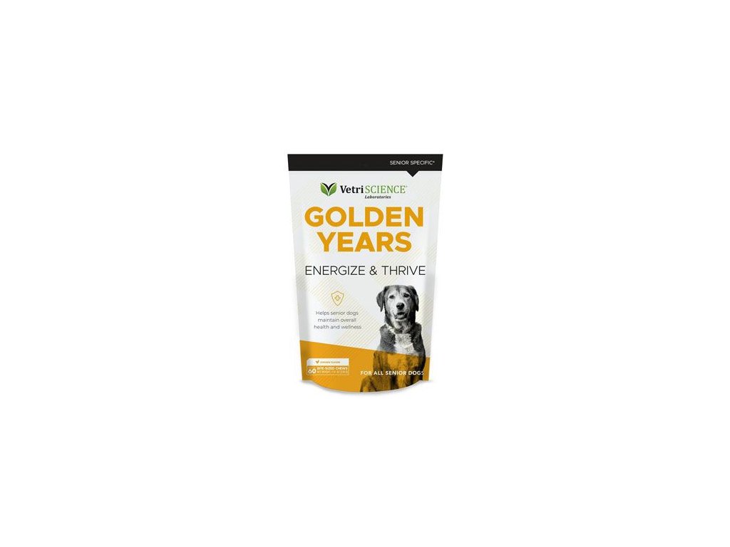 GOLDEN YEARS Energize & Thrive je komplexní multivitamin, s více než 25 veterináři doporučovanými živinami, který uspokojí nutriční potřeby seniorních psů. Energize & Thrive, speciálně navržený pro starší psy, pomáhá čelit účinkům stárnutí kombinací aminokyselin, vitamínů skupiny B, minerálů a omega mastných kyselin. Tato receptura specifická pro seniory podporuje imunitní a trávicí funkce, zdravou pokožku a srst, funkci srdce a nervů a celkovou pohodu. Taurin je obsažen pro podporu správné funkce kardiovaskulárního systému. Pamlsky s příchutí kuřecích jater jsou bez obsahu zrnin, snadno se rozdělí na kousky a jsou vhodné pro psy s citlivým zažíváním.Účinné látky: