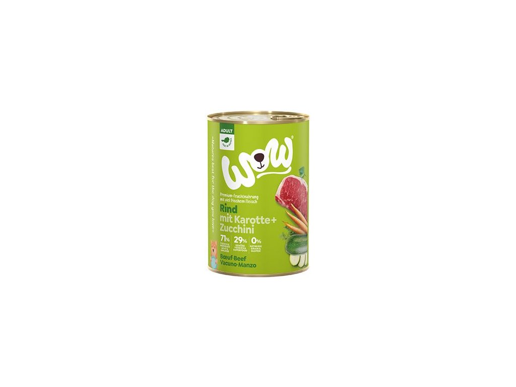 WOW Dog Hovězí s karotkou je kompletní mokré krmivo pro dospělé psy všech plemen se 71% obsahem masa a vnitřností od předního rakouského výrobce. Maso je doplněno zeleninou, bylinkami z Alp a vysoce kvalitním lněným olejem. Konzervy jsou plněné v rodinné rakouské firmě z místních, většinou alpských, surovin z čisté přírody.