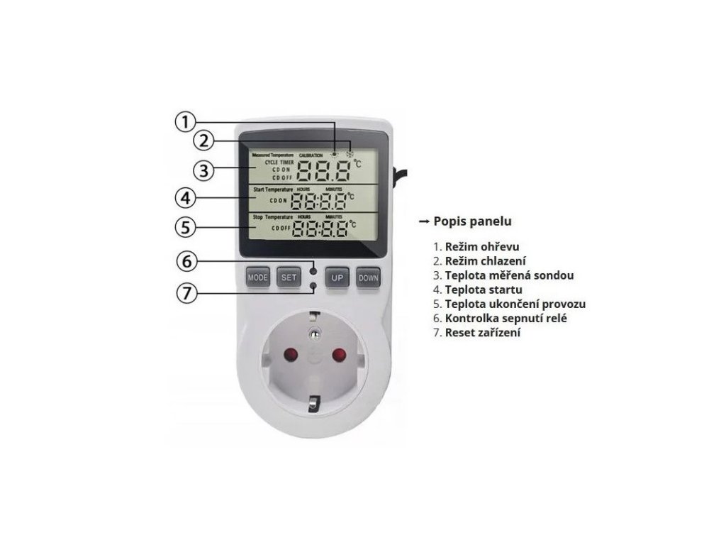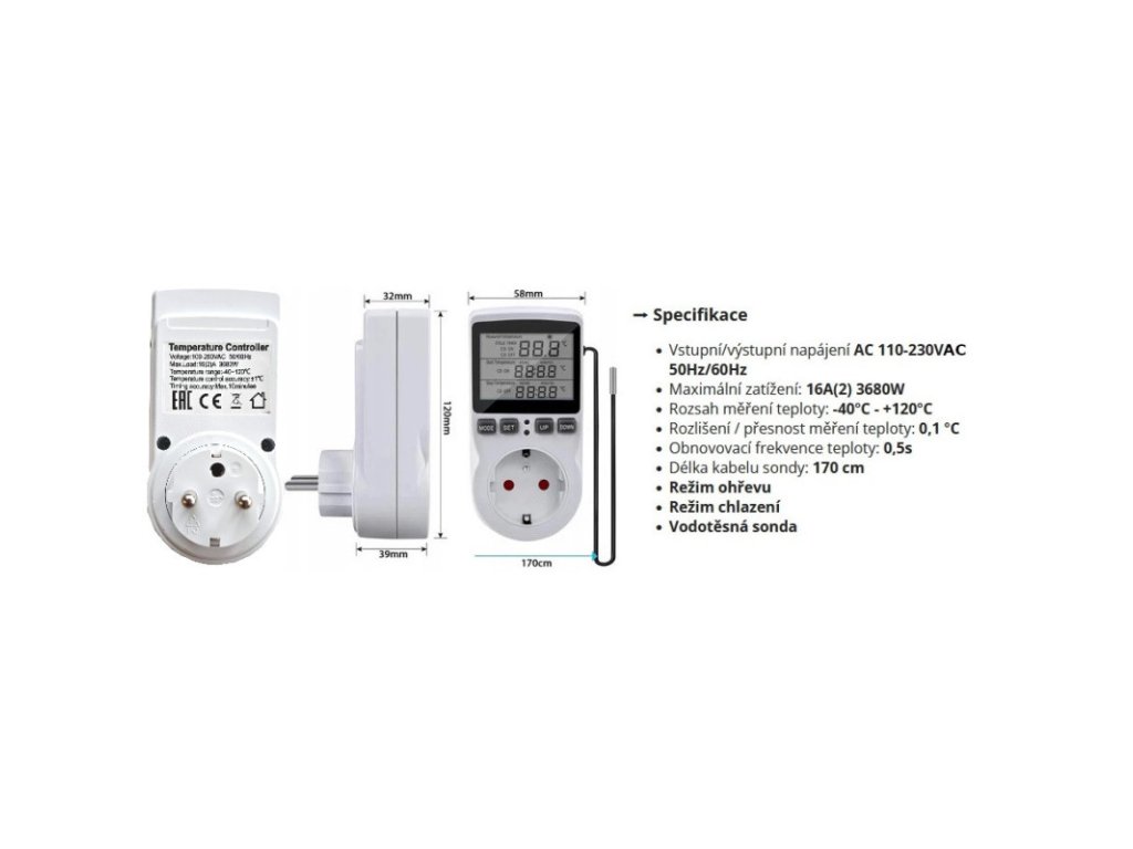 Regulátor teploty zásuvkový s externím čidlem. Termostat s čidlem je vhodný k výhřevným deskám, miskám a lampám. Použitím regulátoru lze ušetřit za energii a čas.
